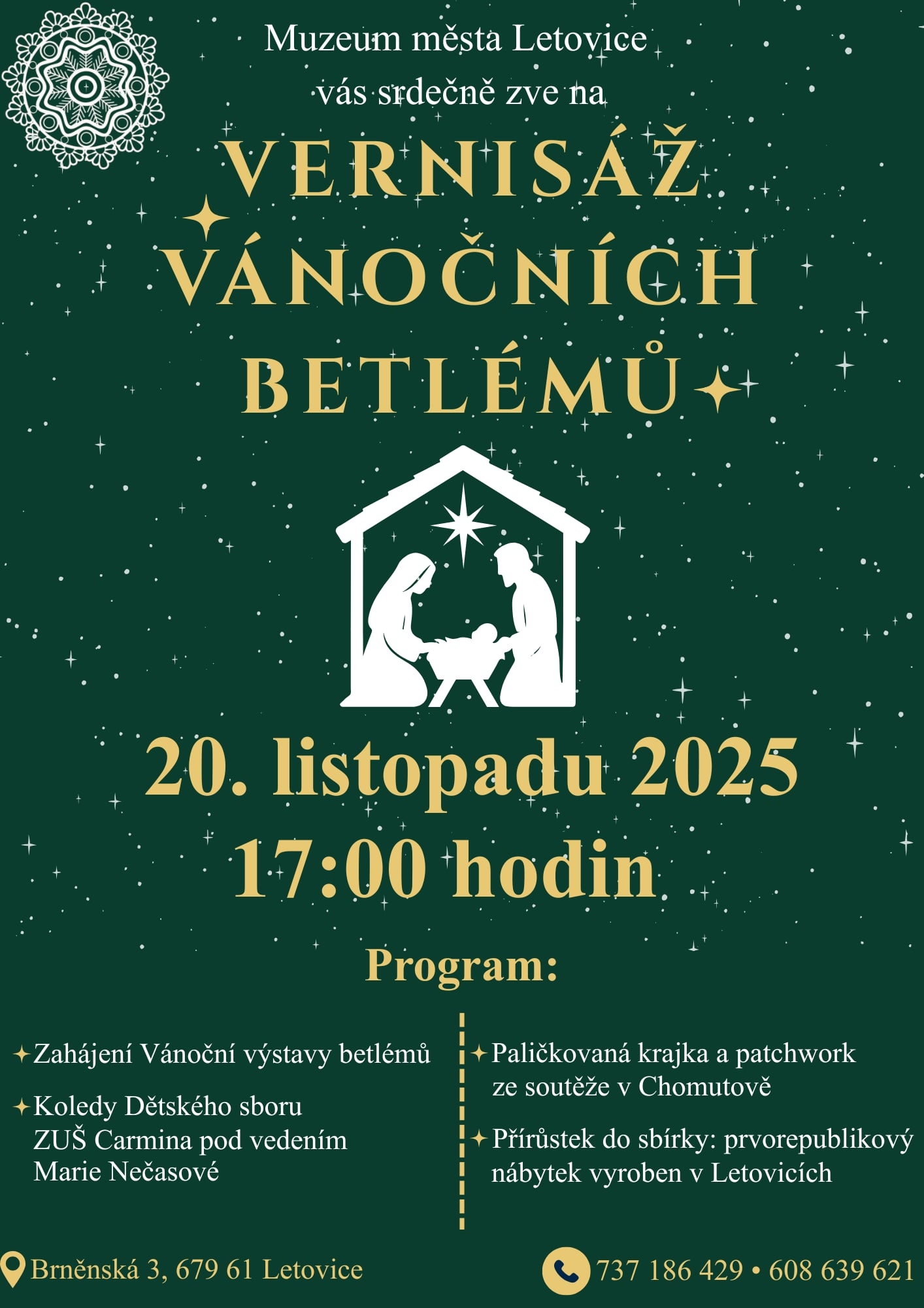 - 20. 11. 2025 - vernisáž VÁNOČNÍ VÝSTAVY BETLÉMŮ. V rámci vernisáže vystoupí Carmina - dětský sbor ZUŠ Letovice a veřejnosti budou představeny nové exponáty sbírky muzea, pořízené v tomto roce