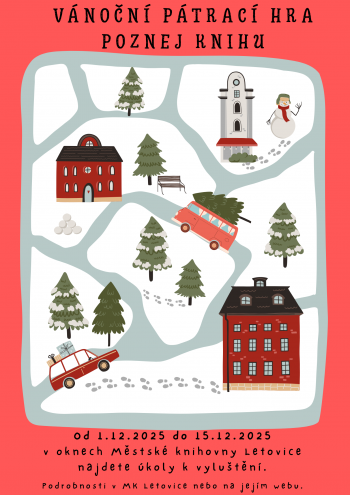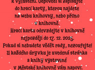 Vánoční pátrací hra poznej knihu je určena nejen pro děti, ale i pro mládež a dospělé. V oknech knihovny najdete úkoly k vyluštění. Odpovědi zapisujte do hrací karty, kterou najdete zde na webu, nebo přímo v knihovně. Hrací kartu odevzdejte v knihovně nejpozději 17.12.2025. Případnou nápovědu najdete přímo v knihovně.