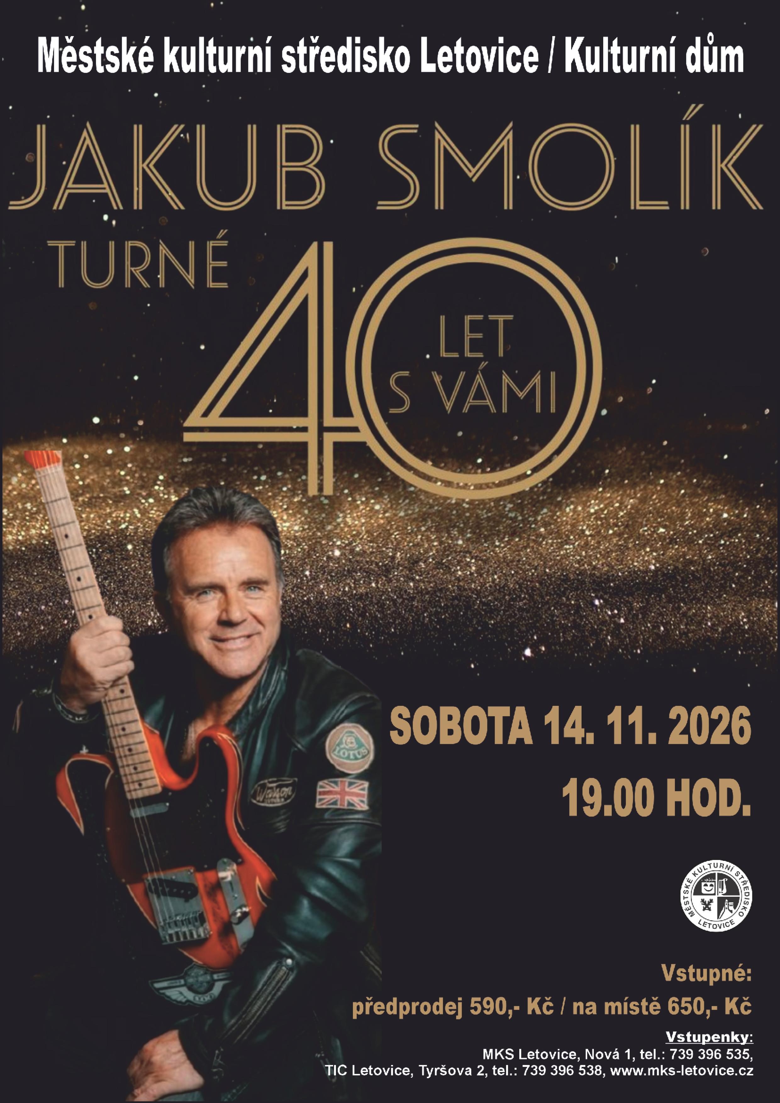 Jedinečné jubilejní turné, které je poděkováním všem fanouškům za neuvěřitelných 40 let na hudební scéně. Jakub Smolík vás provede svými největšími hity, které provázely několik generací, i písněmi, jež psal srdcem a pro radost.