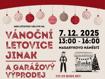 Přijměte pozvání na akci s názvem Vánoční Letovice jinak + garážový výprodej, která se uskuteční v neděli 7. 12. 2025 od 13.00 do 16.00 hodin. Své výrobky k prodeji nabídnou děti letovických mateřských škol, ZŠ, ZUŠ, představí se vám letovické spolky, organizace, sdružení, posedět u kávy můžete v duchovní kavárničce Farnosti Letovice. V doprovodném programu vystoupí mažoretky  VO CO GOU Letovice, těšit se můžete na bohaté občerstvení a teplé nápoje na zahřátí.