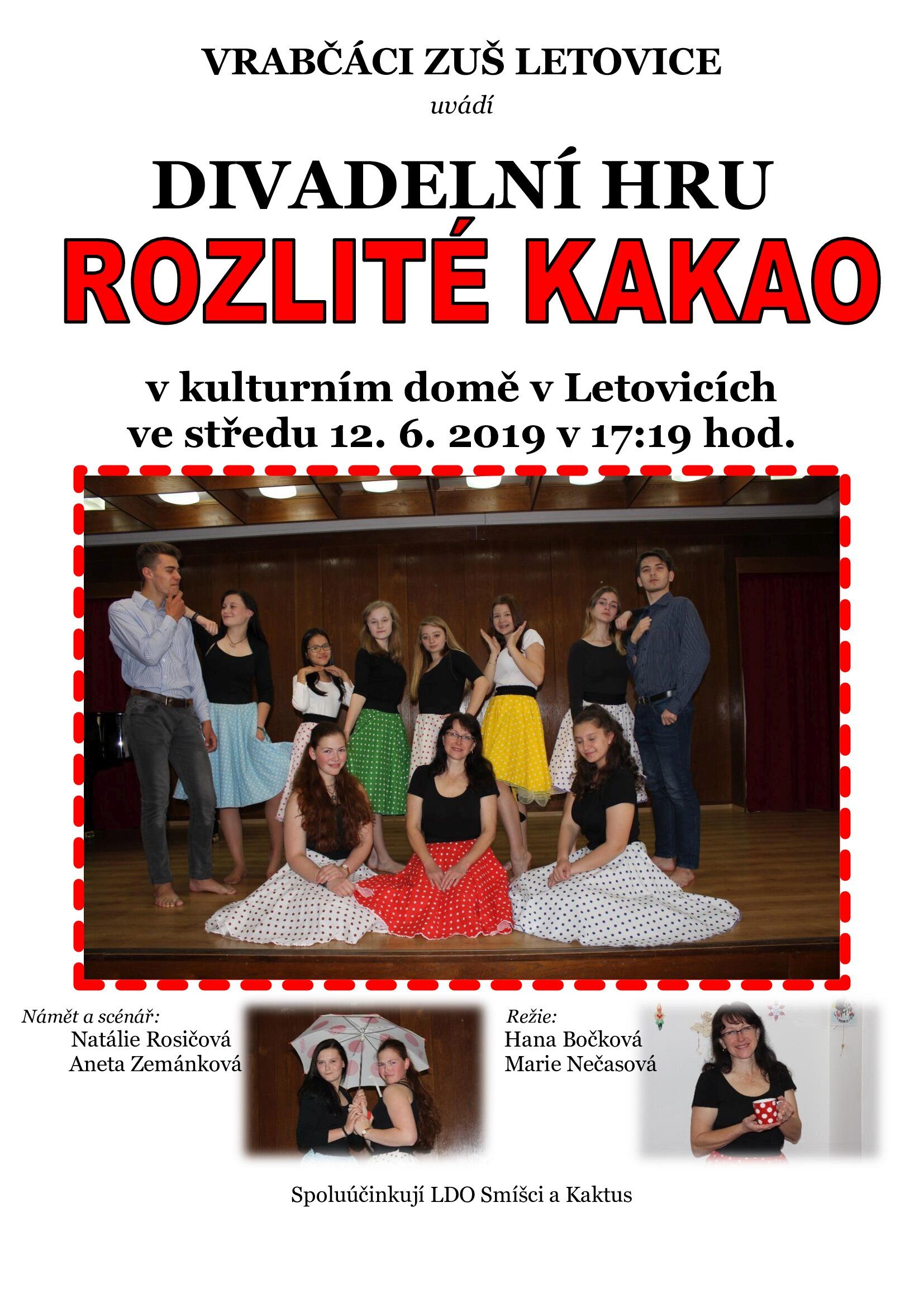 Jste srdečně zváni na divadelní hru Rozlité kakao v podání Vrabčáků ZUŠ Letovice. Spoluúčinkují: LDO Smíšci a Kaktus třídy paní učitelky Hany Bočkové.  Režie: Hana Bočková a Marie Nečasová. Představení se uskuteční v Kulturním domě v Letovicích. ZUŠ Letovice, tel.: 516 474 203, 777 674 203, zusletovice@zusletovice.cz, www.zusletovice.cz