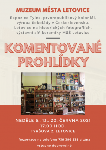 Muzeum města Letovice zve všechny milovníky historie na komentované prohlídky muzejních expozic. Poodhalíme Vám Letovice na historických fotografiích, nahlédnete do výroby čokolády v Československu, navštívíte prvorepublikový koloniál, expozici Tylexu či výstavní síň keramiky MSŠ Letovice. Rezervace prohlídek na telefonu: 739 396 538