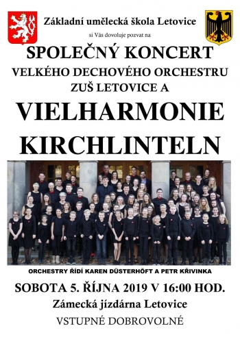Základní umělecká škola Letovice Vás srdečně zve na společný koncert velkého dechového orchestru ZUŠ Letovice a Vielharmonie Kirchlinteln, který se uskuteční v sobotu 5. října v 16:00 hodin v jízdárně letovického zámku. Orchestry řídí Karen Düsterhöft a Petr Křivinka.