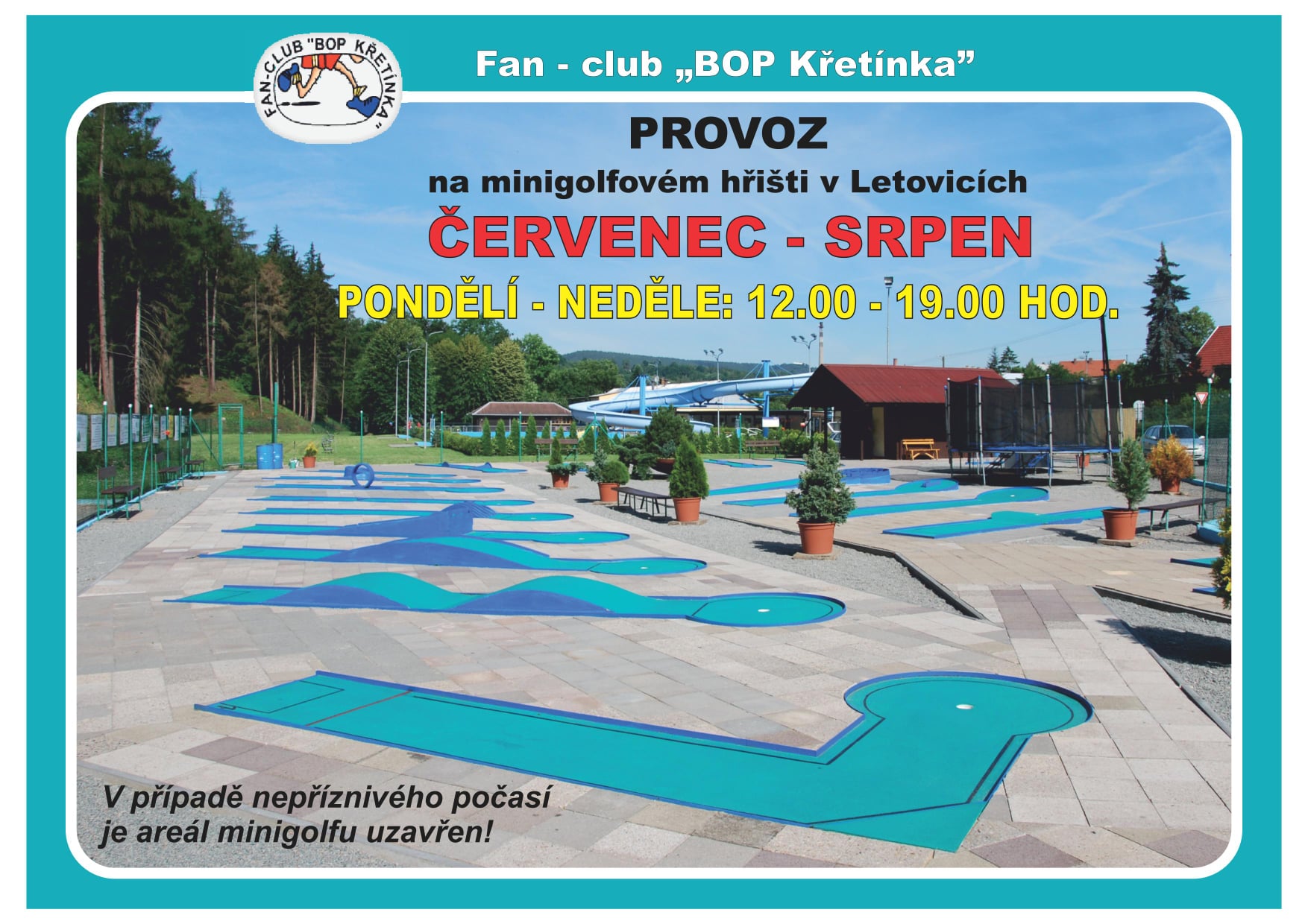 Minigolfové hřiště v Letovicích bude v provozu  během měsíce července: pondělí - neděle: 12.00–19.00 hodin. V případě nepříznivého počasí je areál uzavřen. Více informací na fcb stránce: Fan-Club "BOP Křetínka" z. s.