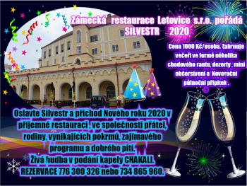 Oslavte Silvestr a příchod Nového roku v Zámecké restauraci v Letovicích s živou hudbou v podání kapely Chakali. Cena akce je 1000 Kč na osobu, cena zahrnuje večeři v podobě několikachodového rautu, dezerty, mini občerstvení a novoroční přípitek. Rezervaci je možné provést na tel.: 776 300 326, 734 865 960.