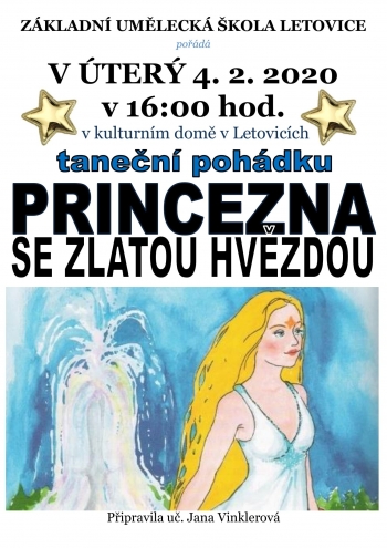 Přijměte srdečné pozvání na taneční pohádku Princezna se zlatou hvězdou na čele, ve které se vám představí menší i větší baletky pod taktovkou paní učitelky Jany Vinklerové.