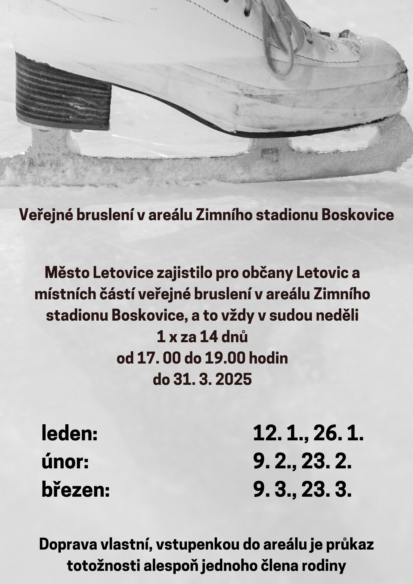 Veřejné bruslení pro občany Letovic. Město Letovice zajistilo pro občany Letovic a místních částí veřejné bruslení v areálu Zimního stadionu Boskovice, a to vždy 1x za 14 dní v sudou neděli do 31. 3. 2025. Doprava vlastní, vstupenkou do areálu je průkaz totožnosti alespoň jednoho člena rodiny.