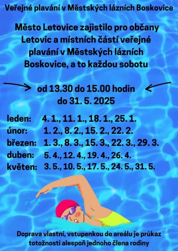 Veřejné plavání v Městských lázních Boskovice. Město Letovice zajistilo pro občany Letovic a místních částí veřejné plavání v Městských lázních Boskovice, a to vždy v sobotu od 13.30 do 15.00 hodin do 31. 5. 2025.