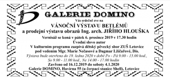 Přijměte pozvání na vernisáž vánoční výstavy betlémů a prodejní výstavy obrazů Ing. Arch. Jiřího Hlouška. V kulturním programu zazpívá dětský pěvecký sbor ZUŠ Letovice pod vedením Mgr. Marie Nečasové a Dagmar Lžíčařové, Dis.