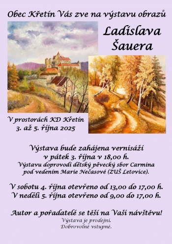 Obec Křetín srdečně zve na výstavu obrazů Ladislava Šauera v prostorách KD Křetín, výstava bude zahájena vernisáží v pátek 3. října v 18.00 hodin, doprovodný program: dětský pěvecký sbor Carmina pod vedením Marie Nečasové (ZUŠ Letovice), sobotu 4. října otevřeno: 13.00-17.00 hodin, v neděli 5. října otevřeno: 9.00-17.00 hodin, výstava je prodejní, vstupné dobrovolné