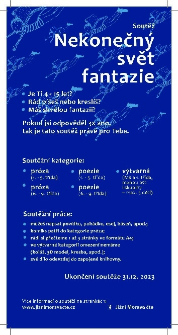 Literární soutěž pro děti od 4–15 let, která se uskuteční za podpory Jihomoravského kraje. Více informací v knihovně nebo na webu www.jiznimoravacte.cz