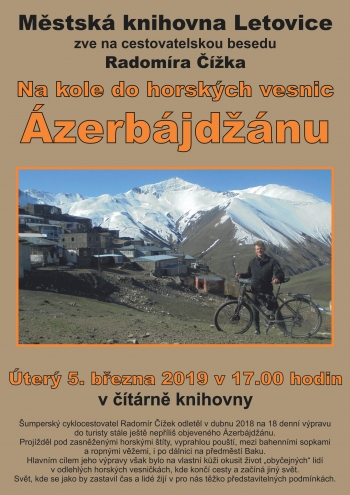 Šumperský cyklocestovatel Radomír Čížek odletěl v dubnu 2018 na 18denní výpravu do turisty stále ještě nepříliš objeveného Ázerbájdžánu. Projížděl pod zasněženými horskými štíty, vyprahlou pouští, mezi bahenními sopkami a ropnými věžemi, i po dálnici na předměstí Baku. Hlavním cílem jeho výpravy však bylo na vlastní kůži okusit život „obyčejných“ lidí v odlehlých horských vesničkách, kde končí cesty a začíná jiný svět. Svět, kde se jako by zastavil čas a lidé žijí v pro nás těžko představitelných podmínkách.