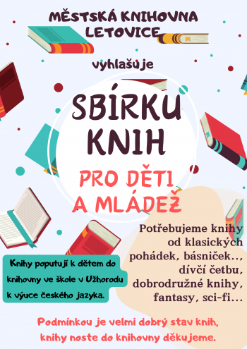 Vyhlašujeme sbírku knih pro děti a mládež do knihovny ve škole v Užhorodu, kde budou sloužit k výuce českého jazyka. Jedná se o klasické pohádky, básničky, dívčí četbu, dobrodružnou, fantasy a sci-fi literaturu. Knihy ve velmi dobrém stavu noste do knihovny. Děkujeme.