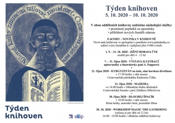 V letošním roce probíhá již 24. ročník Týdne knihoven. Přijďte využít nabídky knihovny vrátit dlouhodobé výpůjčky bez upomínacího poplatku, roční registrace nových čtenářů zdarma i možnosti půjčování e-knih. Těšíme se na setkání s Vámi i při dalších akcích knihovny.