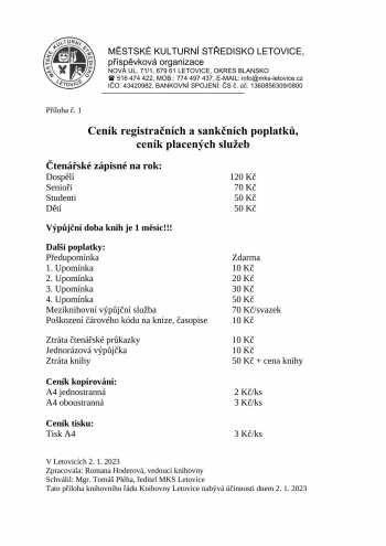 Upozorňujeme, že od 2. ledna 2023 dochází ke změně v příloze č.1 Ceníku služeb Knihovního řádu Městské knihovny Letovice. Mění se pouze registrační poplatek dospělého čtenáře na 120,-Kč a registrační poplatek důchodce na 70,- Kč. Zprostředkování meziknihovní výpůjční služby a mezinárodní meziknihovní výpůjční služby je bezplatné. Čtenář hradí paušální poplatek za jeden dokument k úhradě vynaložených nákladů 70,-Kč. Ostatní poplatky zůstávají stejné.