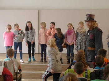 Divadelního představení se čtením "Pohádková škola" Zdeňka Zajíčka principála plzeňských strašidel pro druhé třídy ZŠ.