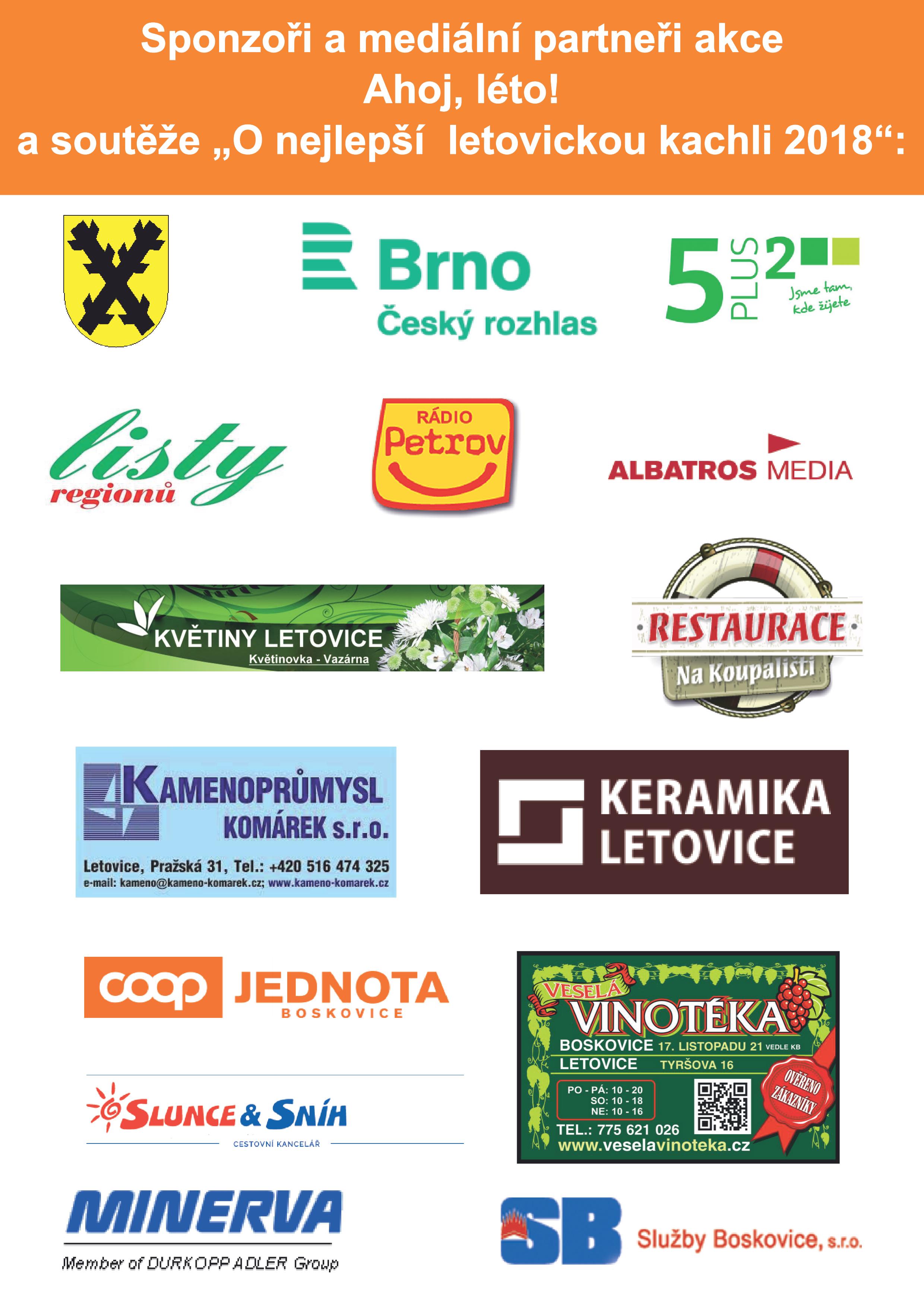 Sponzoři a mediální partneři akce Ahoj, léto! a soutěže „O nejlepší letovickou kachli 2018“: