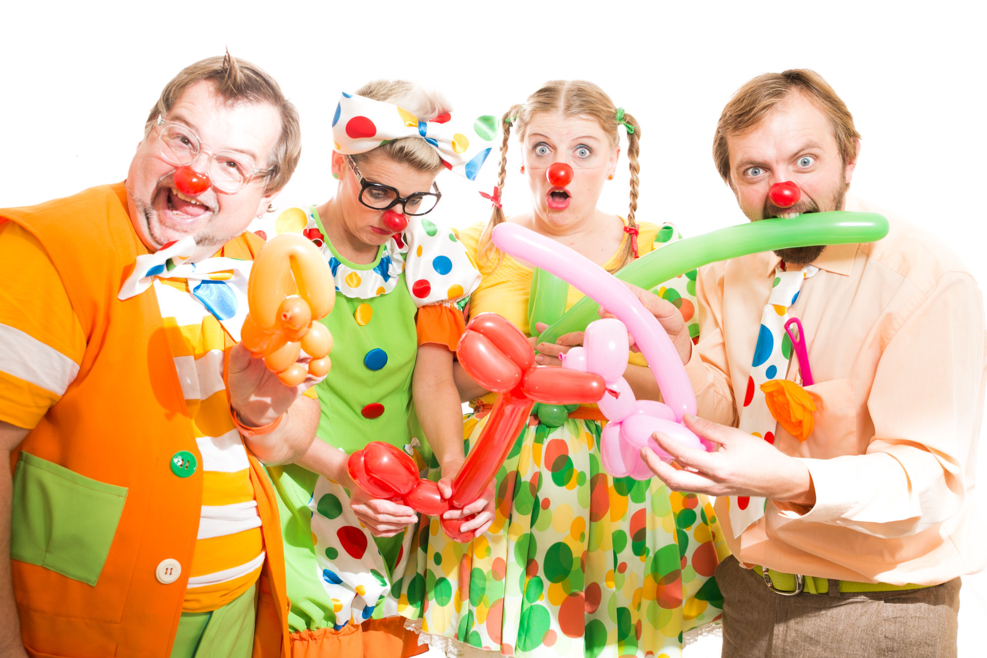 Veselý klaunský program dvou nebo tří klaunů plný písní, tanců, soutěží, her a balonků pro děti i rodiče.