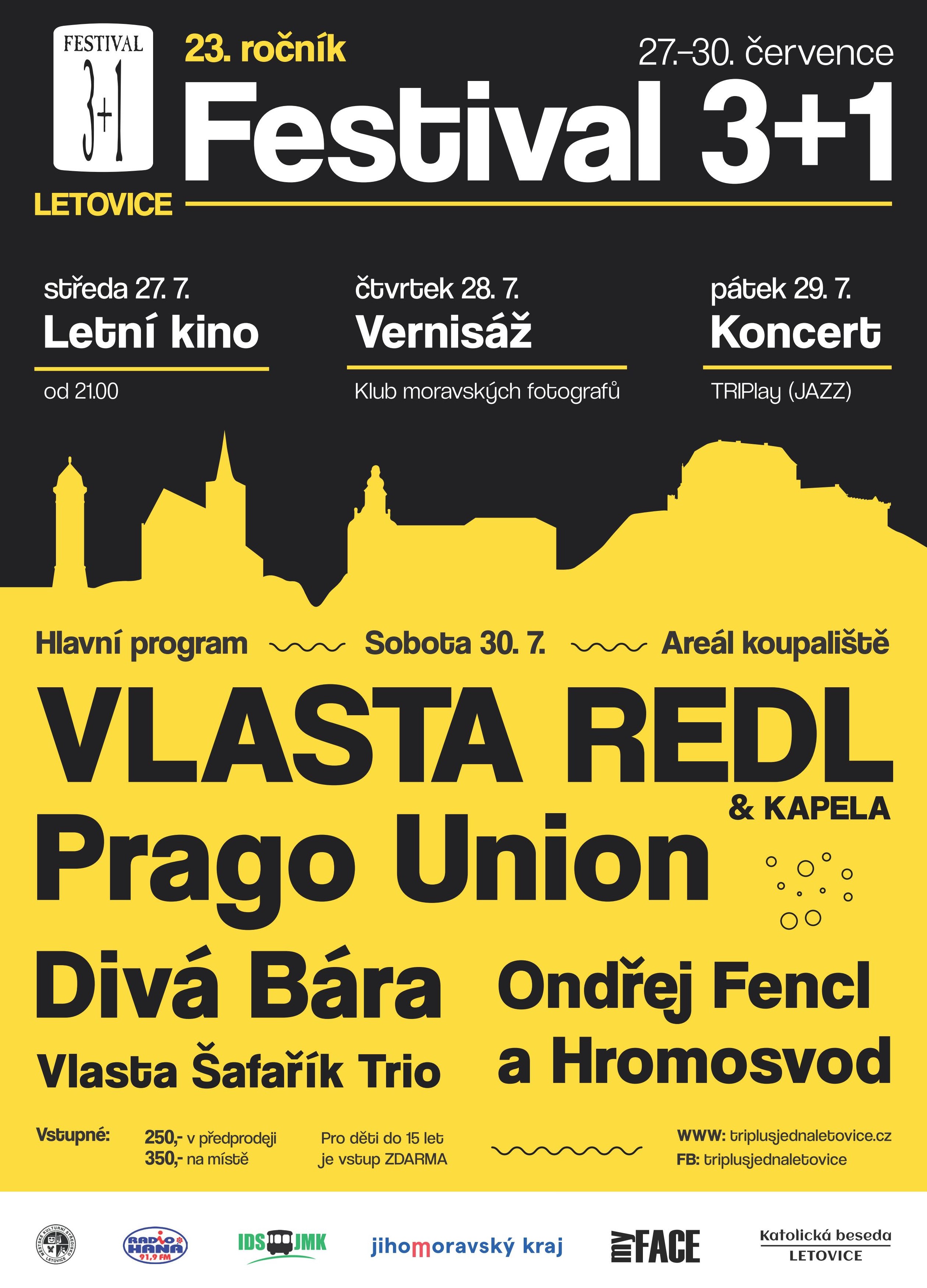 Vstupenky na hlavní den Festivalu 3+1 můžete zakoupit v předprodeji za 250,- Kč ještě dnes 29. 7. 2022 do 22.00 hodin. Na místě budou pouze vstupenky za cenu 350,- Kč.