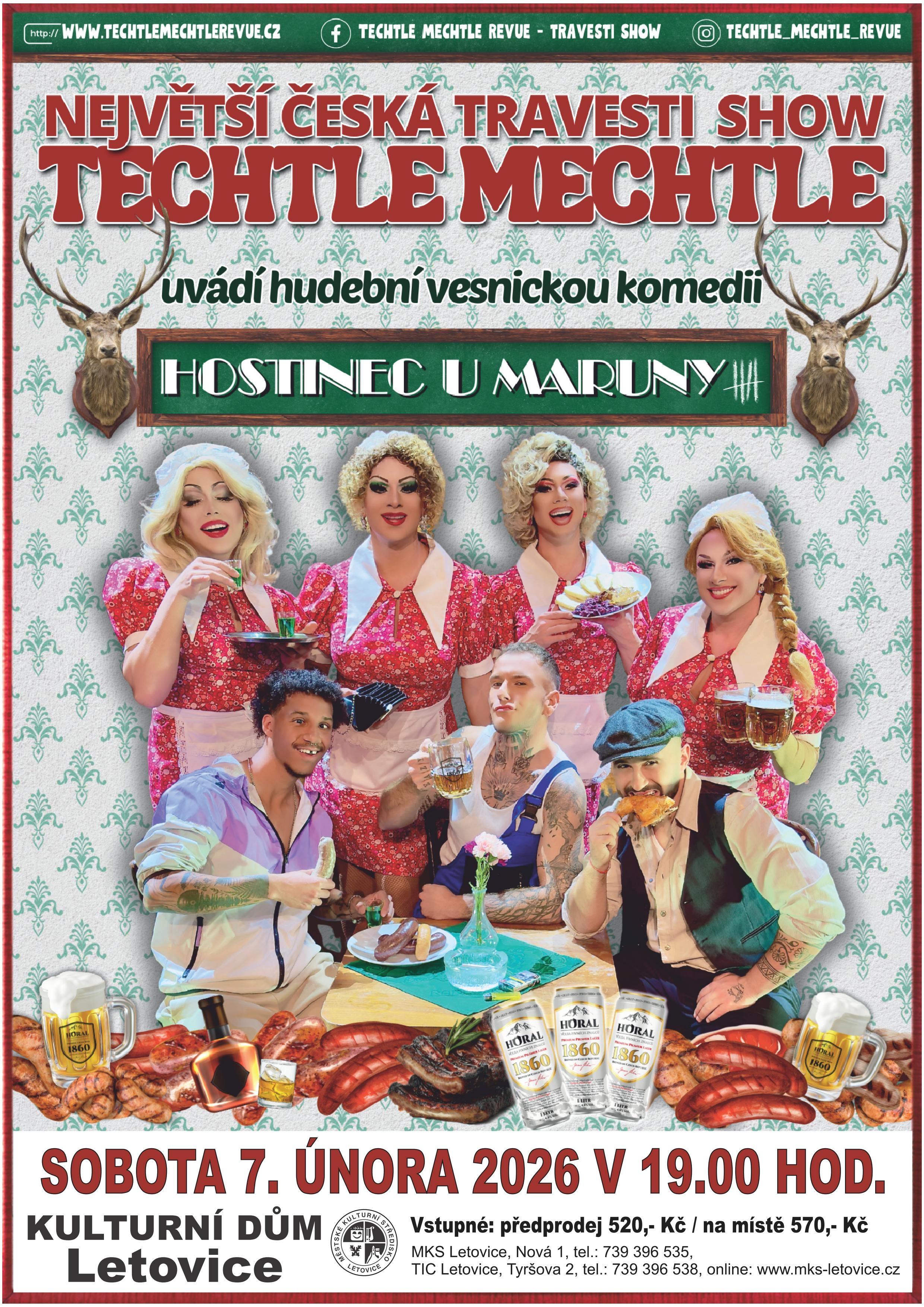 Techtle Mechtle revue je v současné době nejúspěšnější česká show na poli divadelní scény. V podání Techtle Mechtle se vždy jedná o propracované divadelní představení s výpravnou scénou a více jak 80-ti kostýmy. Všechna představení jsou jednou velkou komedií, a to od začátku až do konce. Má to jen jeden háček - všechny role, a to včetně těch dámských, tu hrají pouze muži a ti jsou navíc k nerozeznání od skutečných žen. Pánové Lukáš, Martin, Nikolas a Jarek společně s tanečníky Štěpánem, Sayem a Danem pro Vás tentokrát připravili další bláznivou komedii z prostředí české vesnické hospody.
