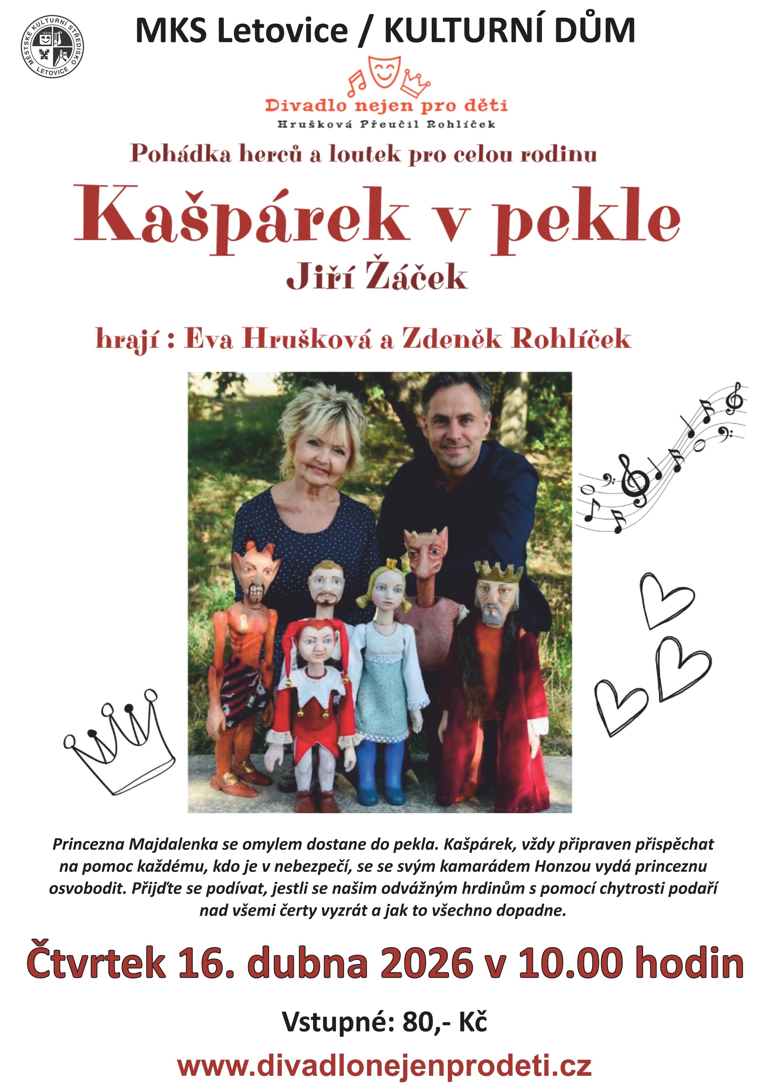 Princezna Majdalenka se omylem dostane do pekla. Kašpárek, vždy připraven přispěchat na pomoc každému, kdo je v nebezpečí, se se svým kamarádem Honzou vydá princeznu osvobodit. Přijďte se podívat, jestli se našim odvážným hrdinům s pomocí chytrosti podaří nad všemi čerty vyzrát a jak to všechno dopadne.