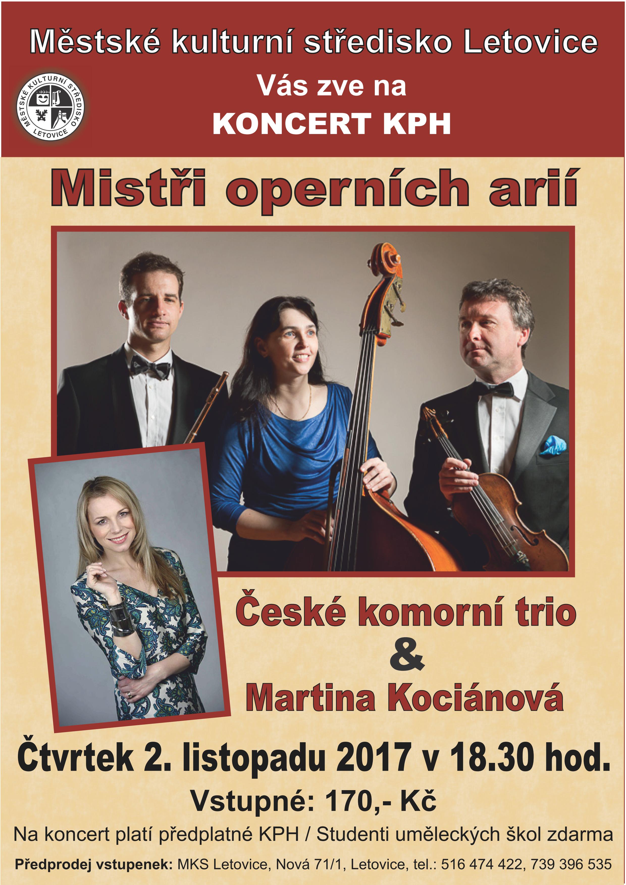 S Českým komorním triem do Letovic letos přijede Martina Kociánová – známá televizní redaktorka a moderátorka a zároveň koncertní pěvkyně – sopranistka. Přejeme všem návštěvníkům tohoto hudebního večera krásný zážitek.