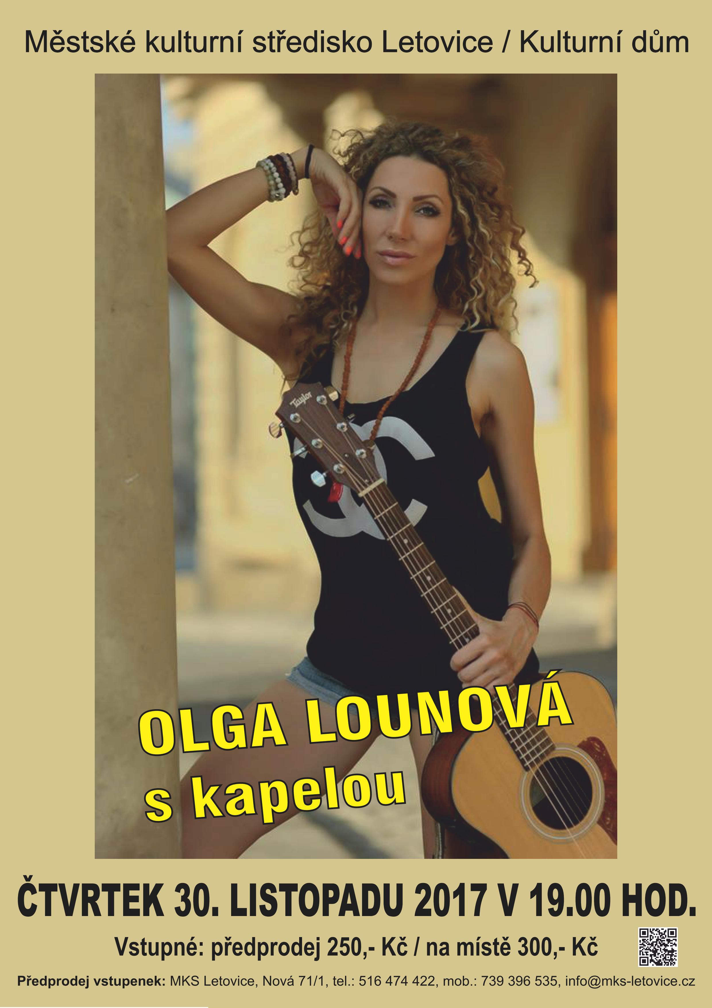 Olga Lounová je populární česká zpěvačka, skladatelka, herečka, závodnice rally. Po zdárném ukončení studia na Pedagogické fakultě v Liberci získala absolutorium na Konzervatoři Jaroslava Ježka v Praze. V současné době se Olga věnuje hlavně vystupování s kapelou a herectví v českých muzikálech a televizních seriálech. Mezi její dosud největší hity patří Láska v housce s Xindlem X a autorské skladby K výškám a Brány svaté. Začátkem roku 2011 vydala svou první studiovou desku Rotující nebe a podepsala smlouvu se světovým vydavatelstvím Universal Music. V roce 2012 odjela své první turné Optický klam a ke konci roku vydala videoklip Dál za obzor, skladbu kterou napsala pro sebe a Karla Gotta. V současné době pracuje střídavě v ČR a v Los Angeles na novém studiovém albu.