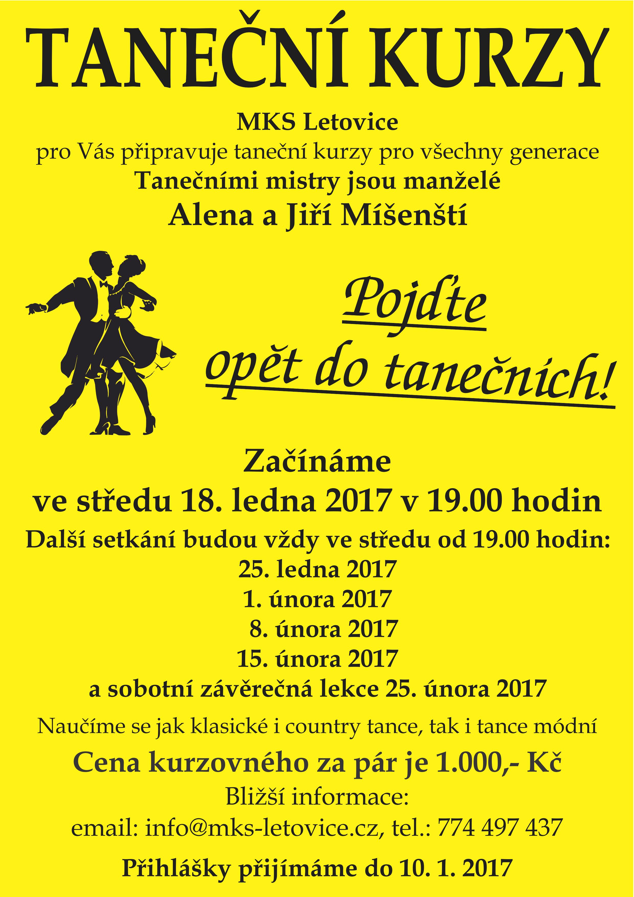 dovolte, abychom Vás opět po roce pozvali do tanečního reje s manželi Alenou a Jiřím Míšenskými u nás v Letovicích. V tanečním rytmu zimní čas rychleji ubíhá a je báječnou příležitostí setkat se s přáteli, něco nového se naučit a vše zúročit na mnoha plesech a bálech, které se v Letovicích i blízkém okolí budou konat.