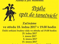 Termíny tanečních lekcí – středy 18. 1., 25. 1., 1. 2., 8. 2., 15. 2. a sobotní závěrečná lekce 25. 2. 2017 od 19.00 hodin.