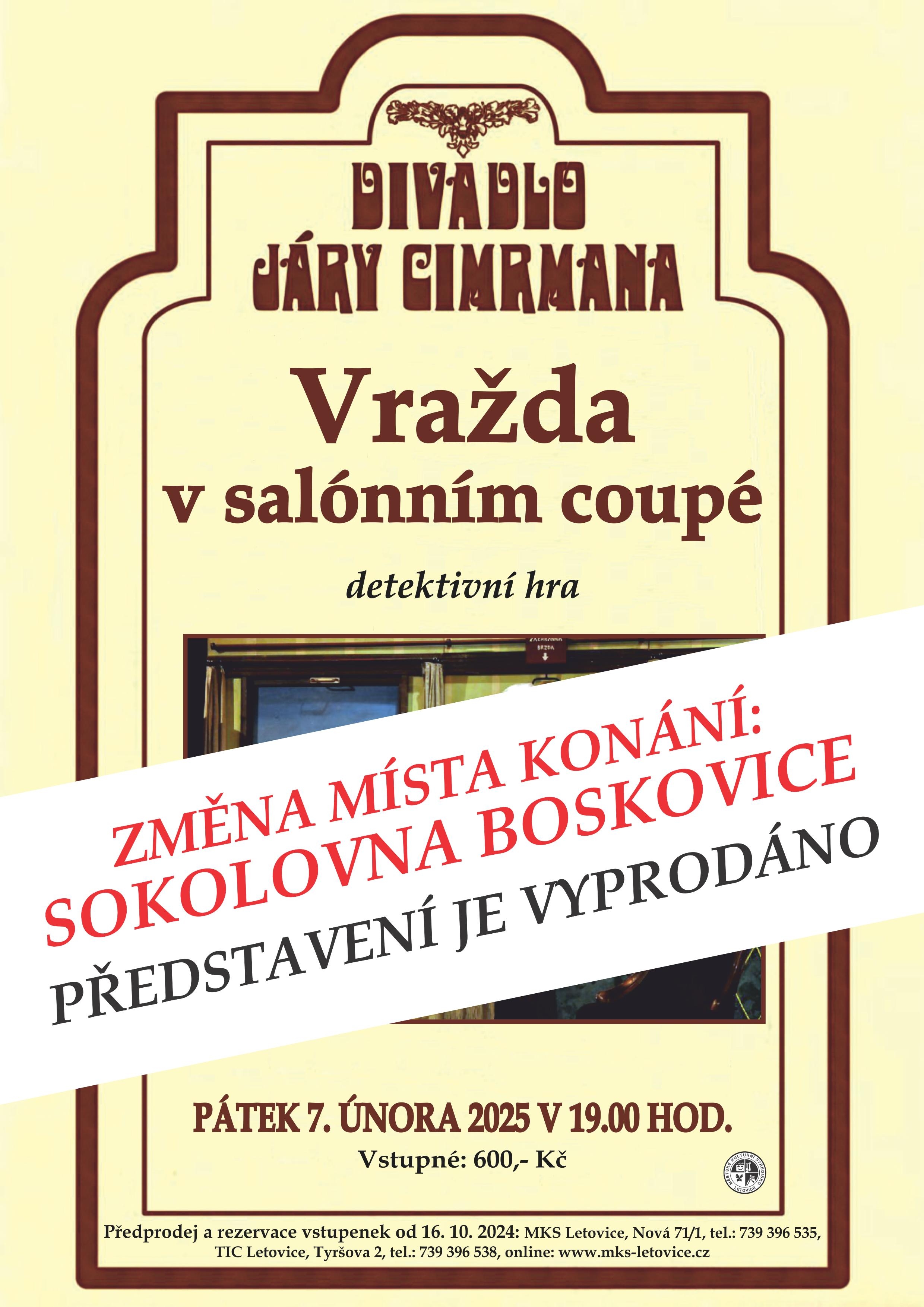 Z výše uvedených důvodů se zítřejší představení Vražda v salonním coupé Divadla Járy Cimrmana přesouvá do Sokolovny Boskovice. Vstupenky zůstávají v platnosti.