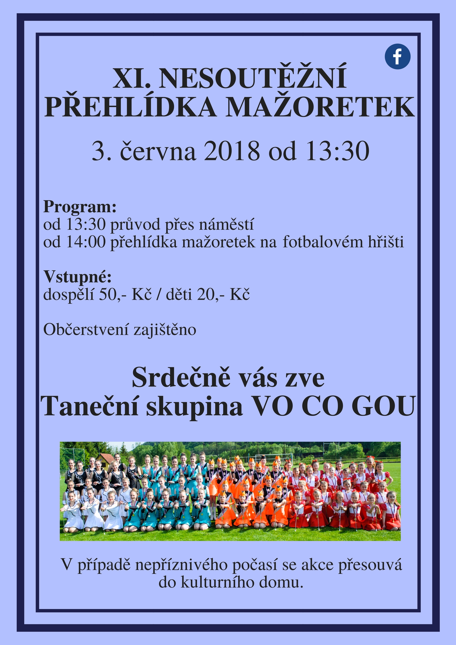 Taneční skupina VO CO GOU vás zve na XI. nesoutěžní přehlídku mažoretek v Letovicích v neděli 3. června 2018.