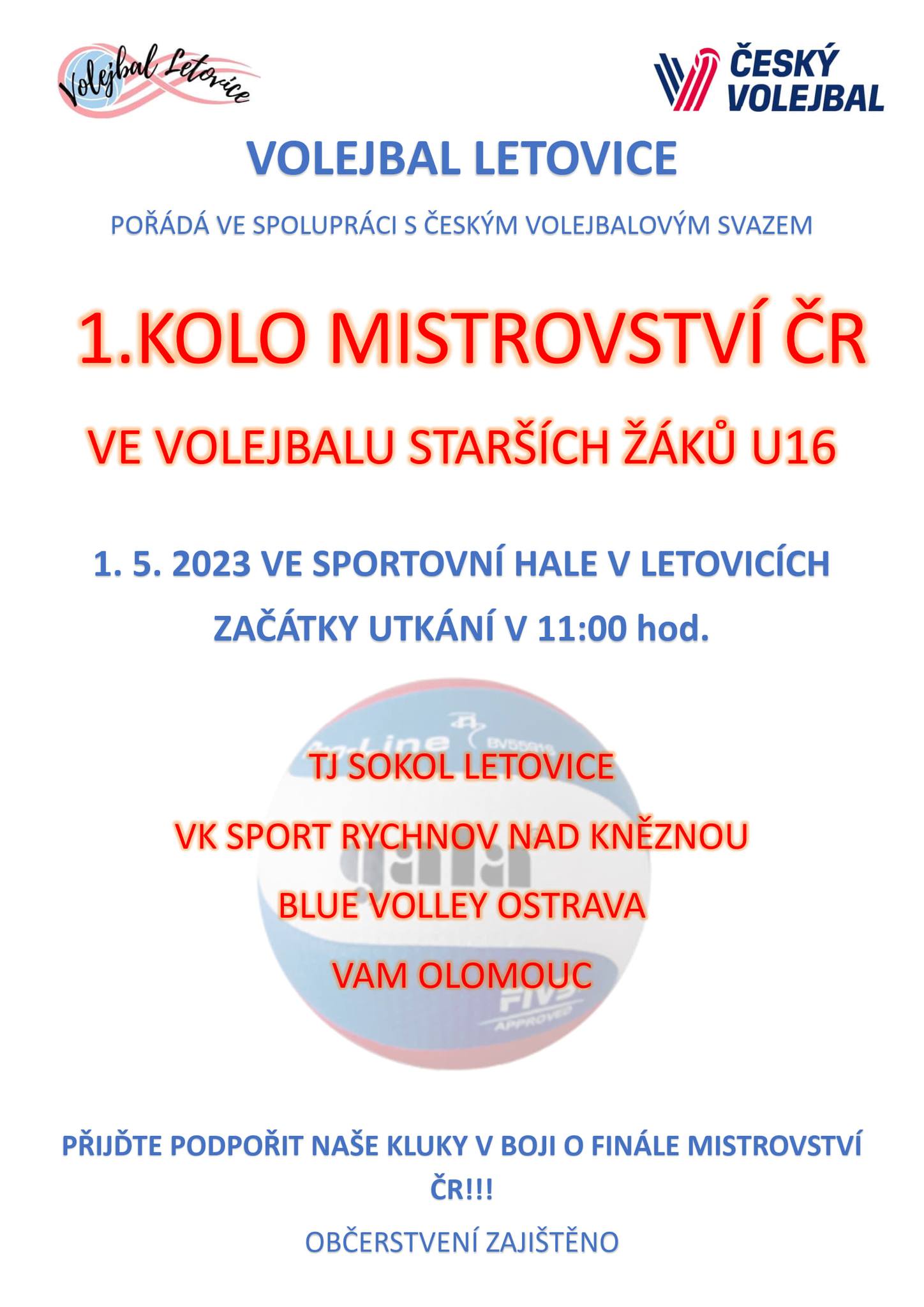 Volejbal Letovice zve všechny na 1. kolo Mistrovství ČR ve volejbalu starších žáků ČR. Přijďte podpořit a fandit v boji o finále Mistrovství ČR, občerstvení zajištěno.