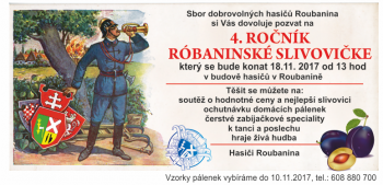Sbor dobrovolných hasičů Roubanina srdečně zve všechny příznivce pálenky a dobré zábavy na 4. ročník róbaninské slivovičke.