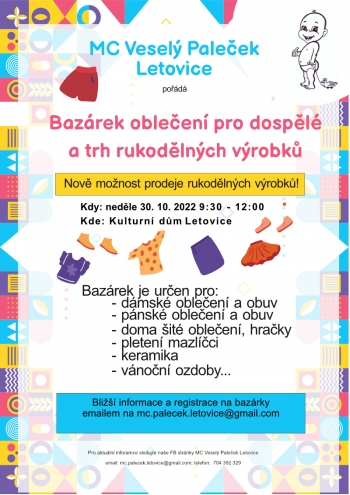 Bazárek oblečení pro dospělé a trh rukodělných výrobků v Kulturním domě v Letovicích, bazárek je určen pro: dámské a pánské oblečení a obuv, doma šité oblečení, hračky, pletené mazlíčky, keramiku, vánoční ozdoby, více info: mc.palecek.letovice@gmail.com