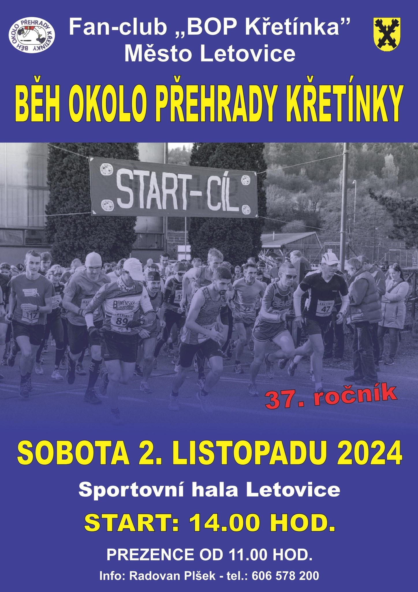 V sobotu 2. listopadu 2024 se koná 37.ročník tradičního "BĚHU OKOLO PŘEHRADY KŘETÍNKY". Zveme všechny běžce a sportovce, aby se zúčastnili tohoto tradičního podzimního běhu.