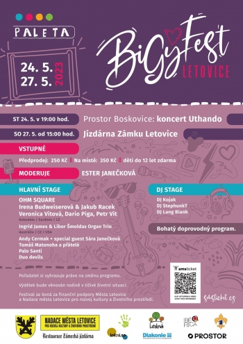 V rámci letovického BigyFestu vystoupí: OHM SQUARE, Irena Budweiserová & JAkub Racek, Veronica Vítová, Dario Piga, Petr Vít a další. Festival moderuje Ester Janečková. Těšit se můžete na bohatý doprovodný program, vstupné: 250 Kč / předprodej, 350 Kč / na místě, děti do 12 let zdarma.