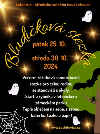 Zveme všechny malé i velké odvážlivce na Bludičkovou stezku v zámeckém parku. Večerní aktivita pro celou rodinu bude instalovaná v zámeckém parku od pátku 25. do středy 30. října, po dobu podzimních prázdnin. S sebou si nezapomeňte vzít baterku a tužku a papír. Projděte stezku se 12 stanovišti, splňte úkoly a v cíli naleznete odměnu. Užijte si zábavu! Více informací naleznete na našich webových stránkách nebo v kanceláři Letokruhu.