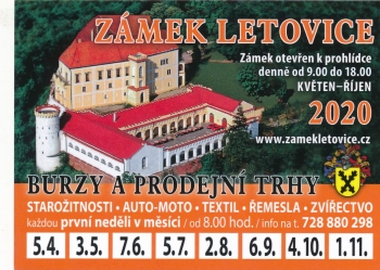 Přijměte pozvání na oblíbené Burzy a prodejní trhy na zámku v Letovicích. Prodat či koupit můžete starožitnosti, auto–moto, textil, řemesla, zvířectvo a jiné. Pronájem stolu: 200,- Kč, vstupné na burzu: 40,- Kč.