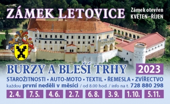 Burza starožitností a sběratelských kuriozit, oblíbená burza starožitností a veškerých sběratelských kuriozit ve venkovních prostorách letovického zámku se koná pravidelně první neděli v měsíci. Vyhledávaná burza je rozšířena o starožitnosti, auto-moto, textil, řemesla, zvířectvo a různé jiné. Vše zde koupíte a prodáte, a to v čase od 8.00 do 12.00 hodin. Pronájem stolu: 200 Kč, vstupné na burzu: 50 Kč, veškeré informace na telefonu +420 728 880 298.
