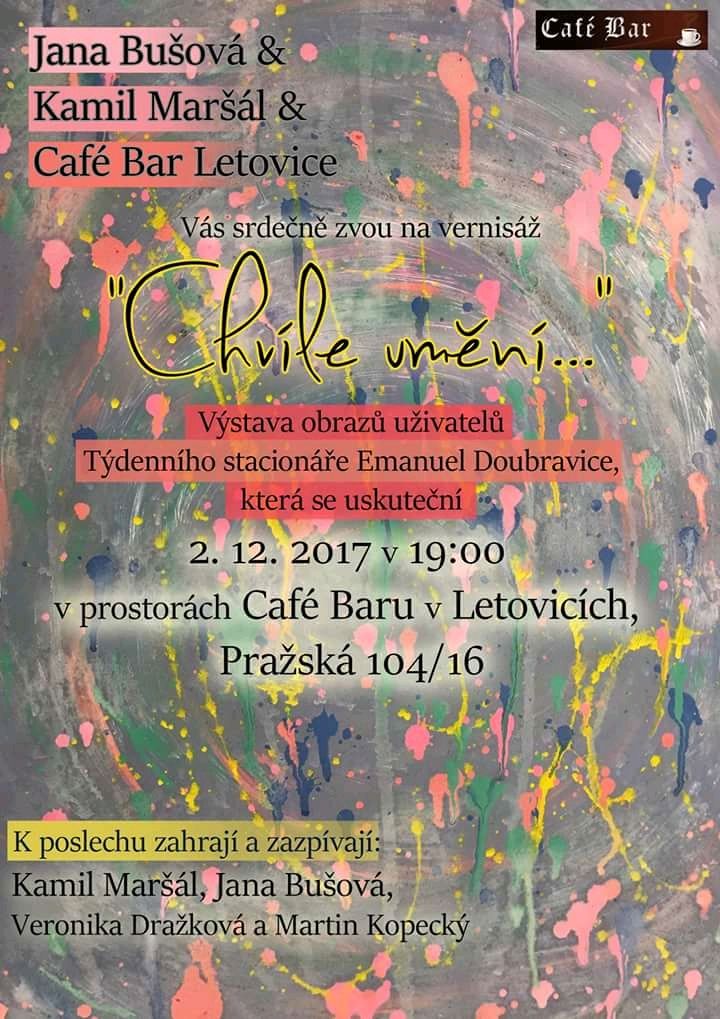 Jana Bušová, Kamil Maršál a Café Bar Letovice Vás srdečně zvou na vernisáž výstavy obrazů uživatelů Týdenního stacionáře Emanuel Doubravice v prostorách Café Baru v Letovicích, Pražská 104/16.