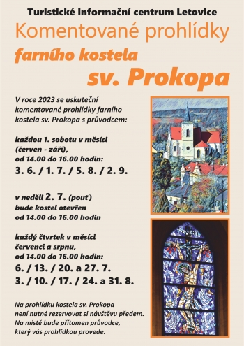 Čtvrteční komentované prohlídky kostela sv. Prokopa v Letovicích. Na prohlídku kostela sv. Prokopa není nutné rezervovat si návštěvu předem, na místě bude přítomen průvodce, který vás prohlídkou provede. Informace ohledně prohlídek: Turistické informační centrum Letovice, Tyršova 2, tel.: 516 476 790, 739 396 538, e-mail: tic@mks-letovice.cz, www.mks-letovice.cz/tic