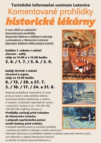 Čtvrteční prohlídky historické lékárny v Nemocnici Letovice. Čtvrteční prohlídky historické lékárny v Nemocnici Letovice ve 14.00 hodin. Oblíbené komentované prohlídky zrestaurované barokní lékárny s průvodcem v objektu bývalého kláštera Milosrdných bratří, které zahrnují výklad o historii a vzniku kláštera, návštěvu unikátní zrestaurované barokní lékárny nacházející se v areálu kláštera a prohlídku klášterní zahrady. Trvání prohlídky je zhruba půl hodiny a je zcela zdarma. Vzhledem k omezené kapacitě lékárny je nutné si prohlídku zarezervovat předem v Turistickém informačním centru Letovice, Tyršova 2, tel.: 516 476 790, 739 396 538, e-mail: tic@mks-letovice.cz, www.mks-letovice.cz/tic