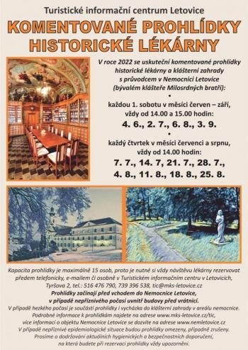 Čtvrteční prohlídky historické lékárny v Nemocnici Letovice ve 14.00 hodin. Oblíbené komentované prohlídky zrestaurované barokní lékárny s průvodcem v objektu bývalého kláštera Milosrdných bratří, které zahrnují výklad o historii a vzniku kláštera, návštěvu unikátní zrestaurované barokní lékárny nacházející se v areálu kláštera a prohlídku klášterní zahrady. Trvání prohlídky je zhruba půl hodiny a je zcela zdarma. Vzhledem k omezené kapacitě lékárny je nutné si prohlídku zarezervovat předem v Turistickém informačním centru Letovice, Tyršova 2, tel.: 516 476 790, 739 396 538, e-mail: tic@mks-letovice.cz, www.mks-letovice.cz/tic