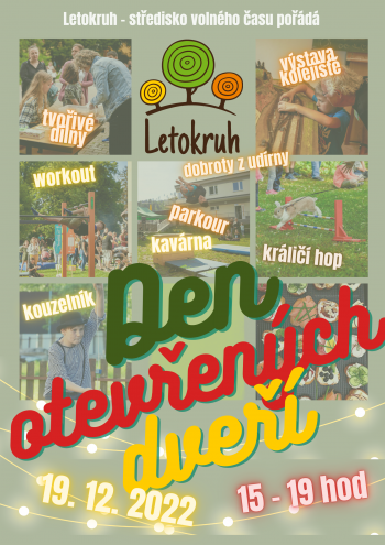Srdečně Vás zveme na Den otevřených dveří! Těšte se na zábavu pro malé i velké - vystoupení kouzelníka, workoutu a parkouru, tvořivé dílny, králičí hop, výstavu výtvarné soutěže ,,Anděl" a modelového kolejiště, kavárnu i udírnu! To vše v budově Letokruhu od 15 -19 hodin v pondělí 19. 12. 2022.