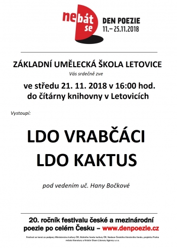 V programu zazní básně v podání Literárně – dramatického oboru ZUŠ Letovice pod vedením Hany Bočkové.