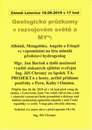 Albánii, Mongolsko, Angolu a Etiopii ve vzpomínání na léta minulá představí hydrogeolog Mgr. Jan Bartoň a další možnosti využití získaných zjištění zveřejní Ing. Jiří Chromý za Spolek TA-PROJEKTA s hosty.