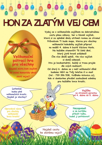 Od úterý 6. dubna se v naší velikonoční dílně budeme těšit na Tvůj telefon či email (tel.: 739 396 538, tic@mks-letovice.cz), kde si domluvíme předání zasloužené odměny pro každého lovce kraslic.