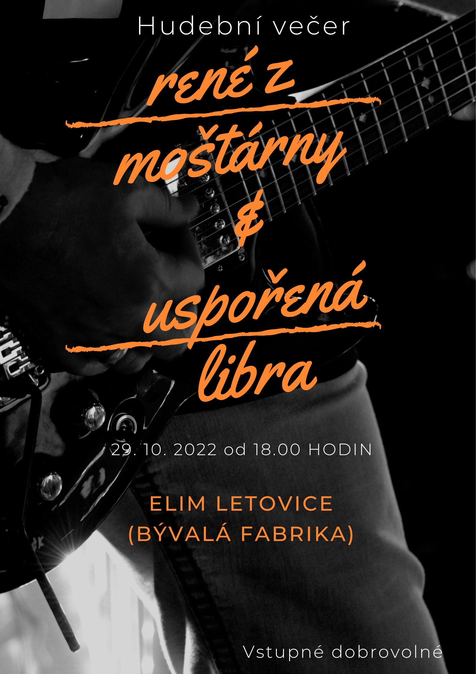 Přijměte pozvání na hudební večer, kde vám v prostorách Elimu Letovice (bývalá Fabrika) zahrají kapely René z moštárny a Uspořená Libra (trio Vlasty Šafaříka). Vstupné dobrovolné, občerstvení připraveno.