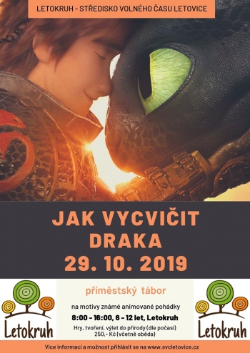 Letokruh - středisko volného času Letovice pořádá příměstský tábor na motivy známé animované pohádky Jak vycvičit draka, který se uskuteční 29. října od 8:00 do 16:00 hodin, pro děti ve věku 6-12 let. Na programu budou hry, tvoření a podle počasí výlet do přírody. Cena je 250 Kč včetně oběda. Více informací na www.svcletovice.cz