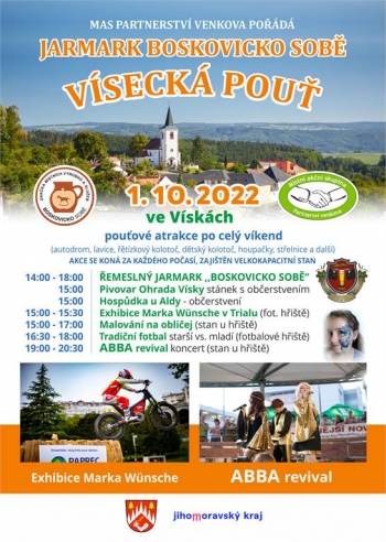 MAS partnerství venkova pořádá Jarmark Boskovicko sobě - Vísecká pouť. Těšit se můžete na pouťové atrakce po celý víkend (autodrom, lavice, řetízkový kolotoč, dětský kolotoč, houpačky, střelnice a další).